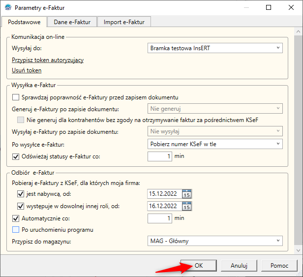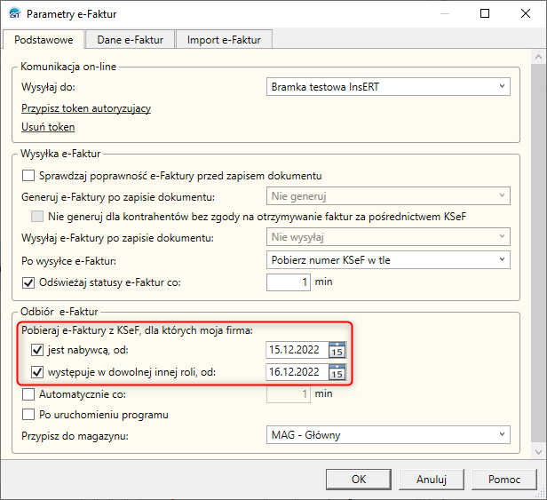 2. Aktywować import e-Faktur, zaznaczając w sekcji Pobieraj e-Faktury z KSeF, dla których moja firma jest: nabywcą i/lub występuje w innej dowolnej roli. Określić datę, od której program ma pobierać dokumenty. Kliknąć OK.