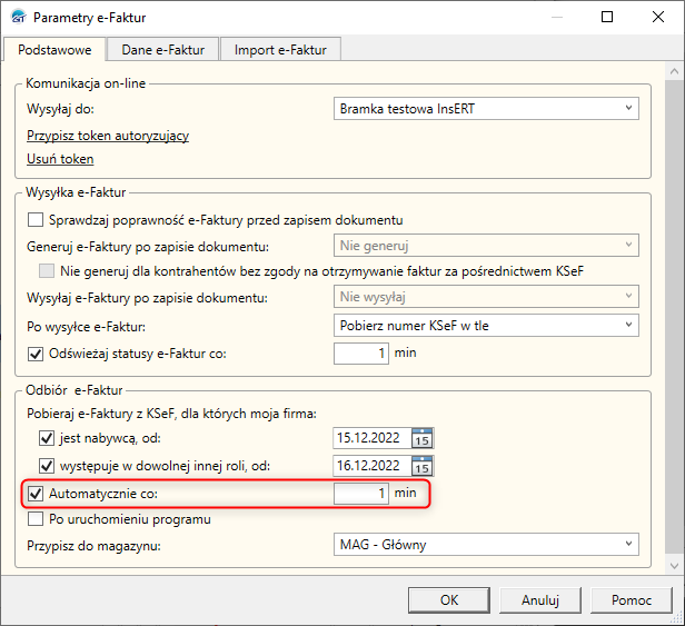 3. Zaznaczyć opcję Automatycznie co i określić o ile minut program będzie sprawdzał, czy istnieją nowe dokumenty do odbioru.