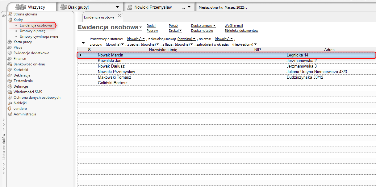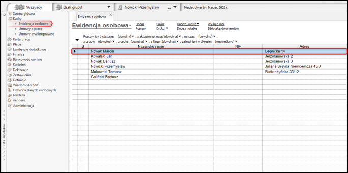1. Przejść do ewidencji osobowej i zaznaczyć pracownika na liście.