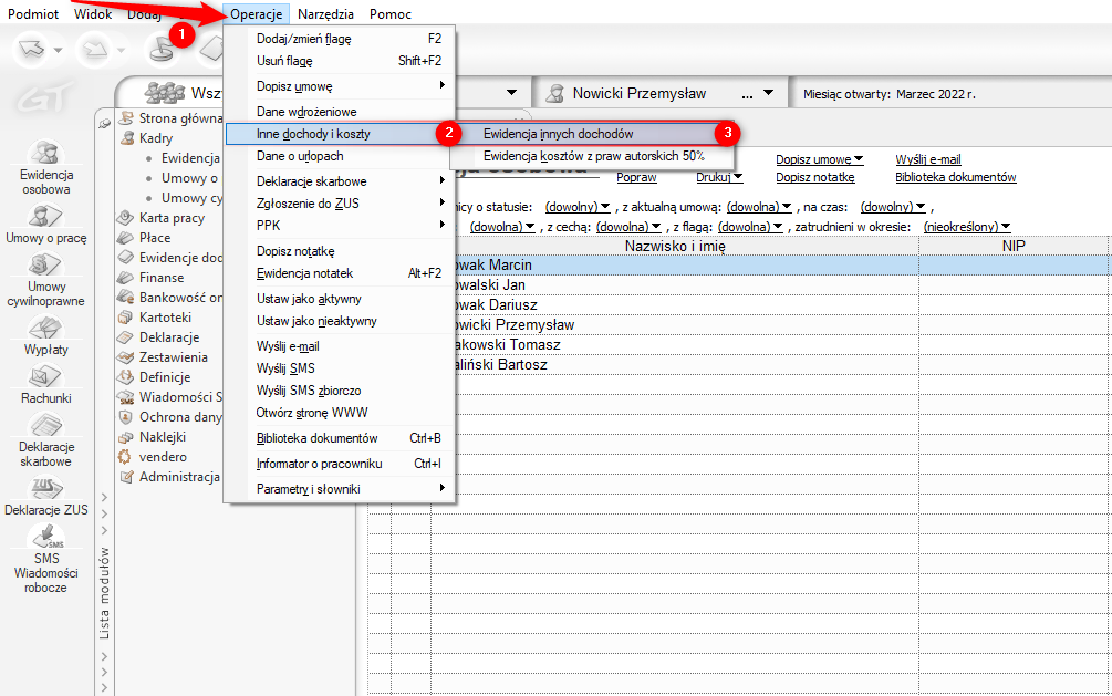 2. Wybrać z górnego menu Operacje – Inne dochody i koszty – Ewidencja innych dochodów.