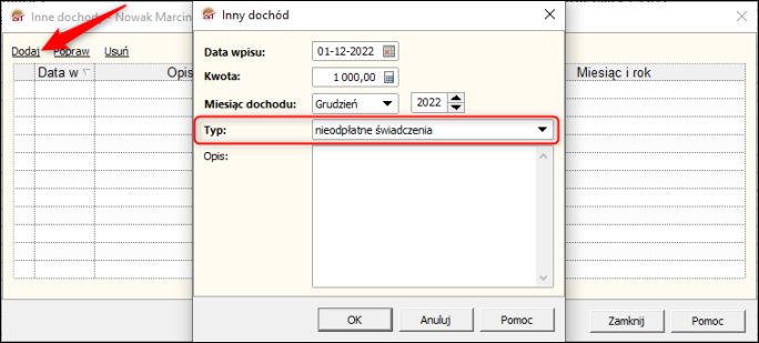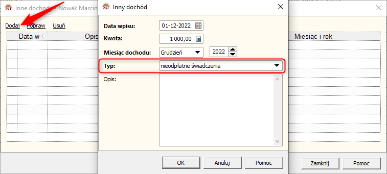 3. W oknie Inne dochody wybrać Dodaj i uzupełnić datę wpisu, kwotę, miesiąc dochodu, typ oraz opcjonalnie opis. Zmiany zatwierdzić przyciskiem OK.