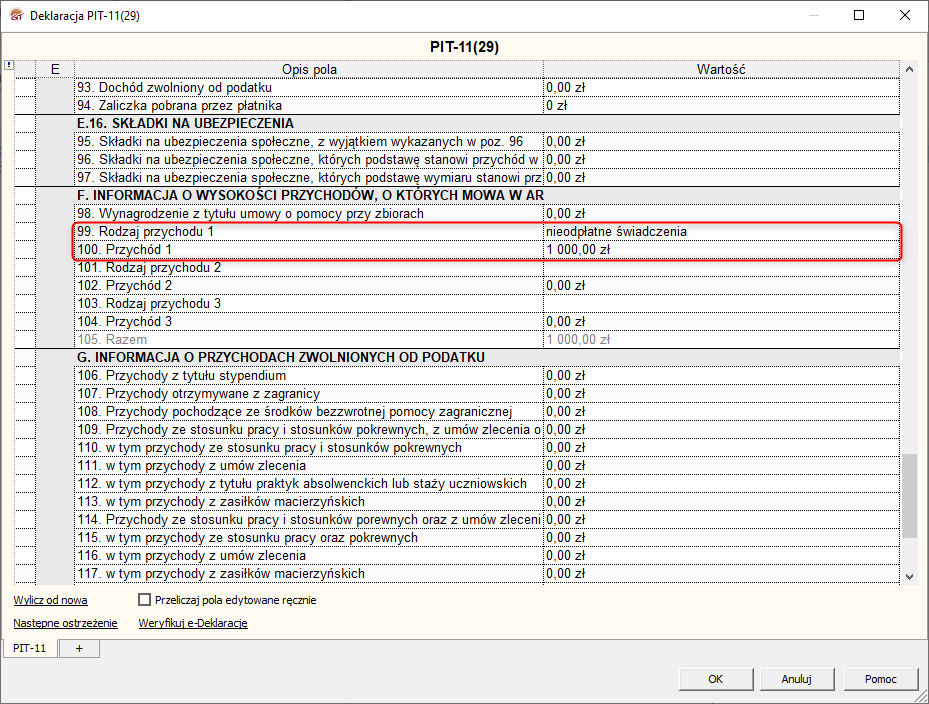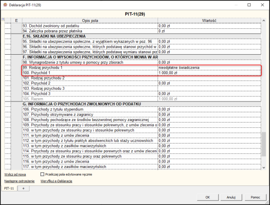 W deklaracji PIT-11 dodane w ten sposób nieodpłatne świadczenie będzie widoczne w sekcji F (Informacja o wysokości przychodów, o których mowa w Art. 20 Ust. 1 ustawy).