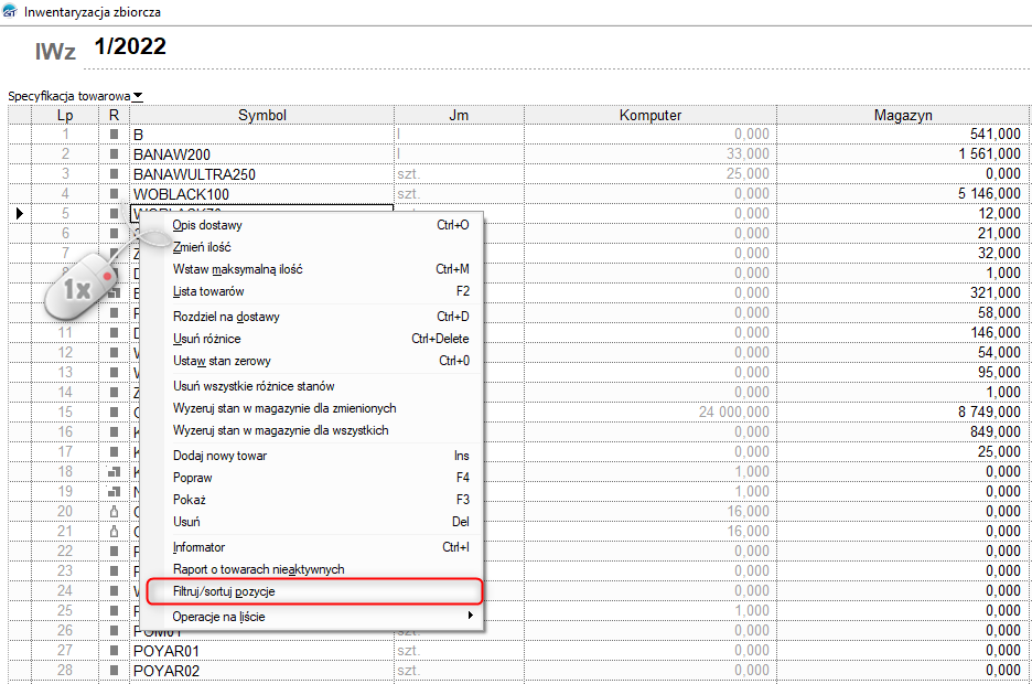 Na dokumencie inwentaryzacji zbiorczej IWz pod prawym przyciskiem myszy dostępna jest opcja filtrowania/sortowania pozycji.