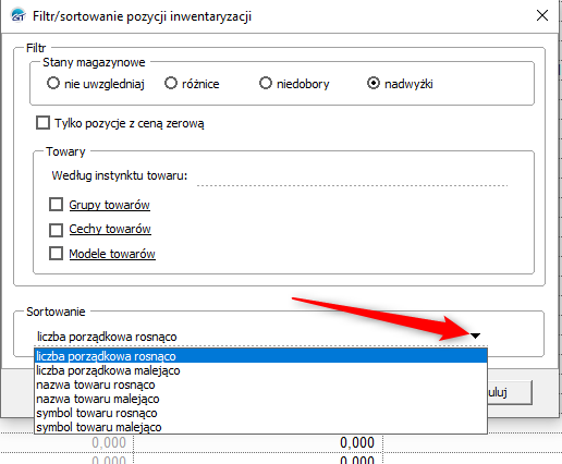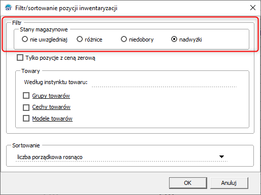 Pozycje można filtrować wg stanu magazynowego, dzięki czemu można np. ustawić wyłącznie widoczność asortymentu, w którym wystąpiły nadwyżki.