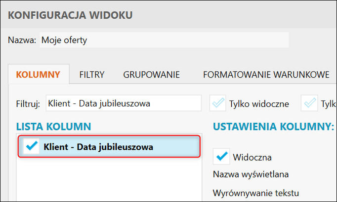Gestor nexo – Jak do widoku Ofert dodać kolumnę Klient – Data jubileuszowa?