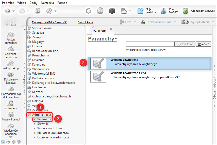 1. Z listy modułów wybrać Administracja – Parametry, a z listy parametrów Wydanie zewnętrzne.