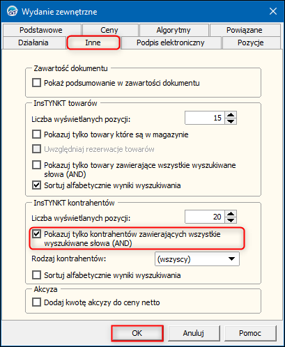 2. W oknie Wydanie zewnętrzne przejść na zakładkę Inne i zaznaczyć opcję Pokazuj tylko kontrahentów zawierających wszystkie wyszukiwane słowa (AND) w sekcji InsTYNKT kontrahentów. Zmiany zapisać przyciskiem OK.