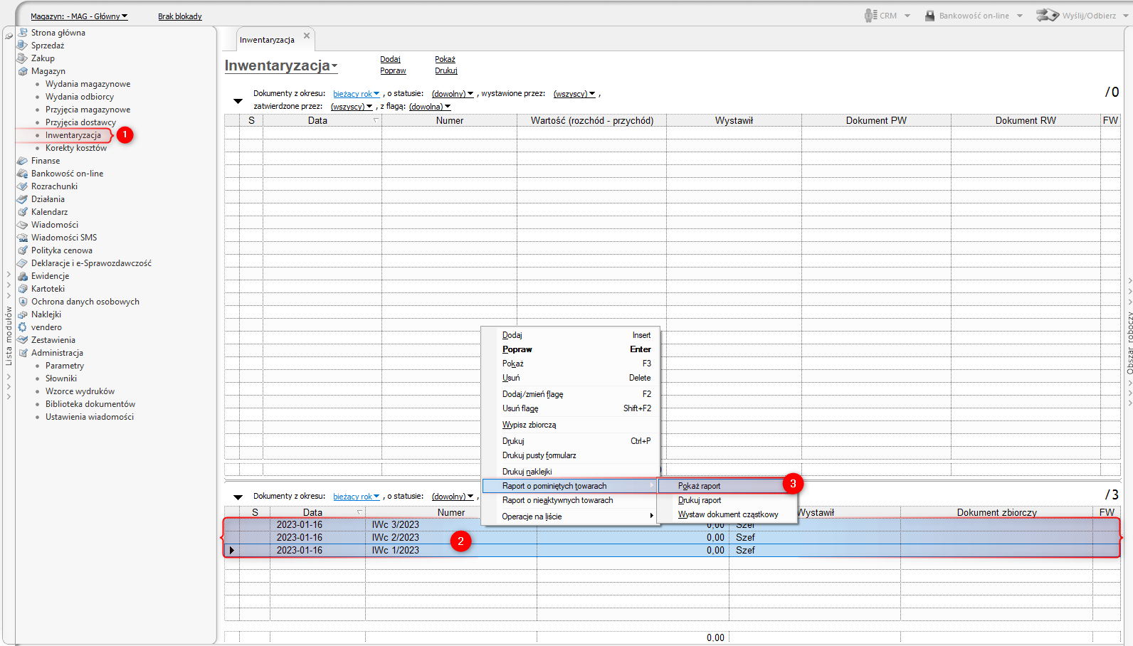 1. Przejść do modułu Inwentaryzacja i wybrać z menu kontekstowego Raport o pominiętych towarach. Umożliwia on podgląd, wydruk oraz wystawienie inwentaryzacji cząstkowej na pominięte towary. Raport ten zostanie wykonany zbiorczo, jeśli zostanie zaznaczonych kilka dokumentów IWc.