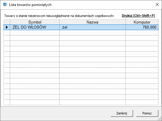 3. Podgląd raportu z towarami o stanie niezerowym nieuwzględnionymi na dokumentach cząstkowych można wydrukować, wybierając skrót klawiszowy Ctrl+Shift+P lub opcję Drukuj.