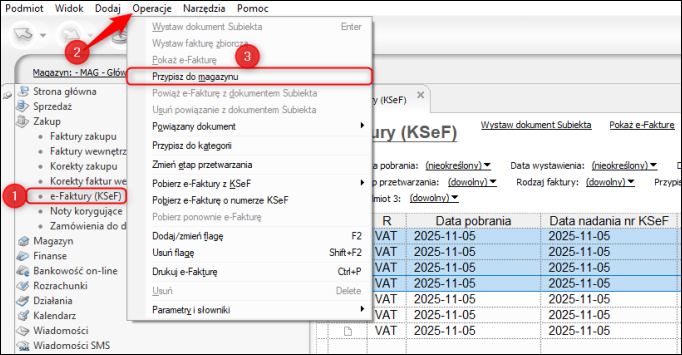 ​1. Przejść do modułu Zakupe-Faktury. Następnie zaznaczyć dokumenty na liście i kliknąć górne menu OperacjePrzypisz do magazynu.
