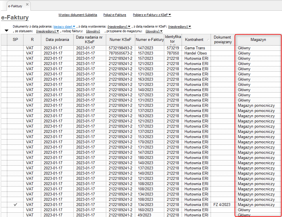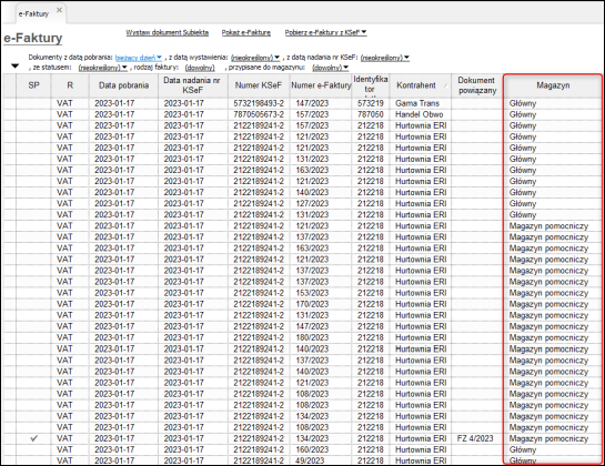 Na liście e-Faktur wyświetli się stosowna informacja w kolumnie Magazyn.