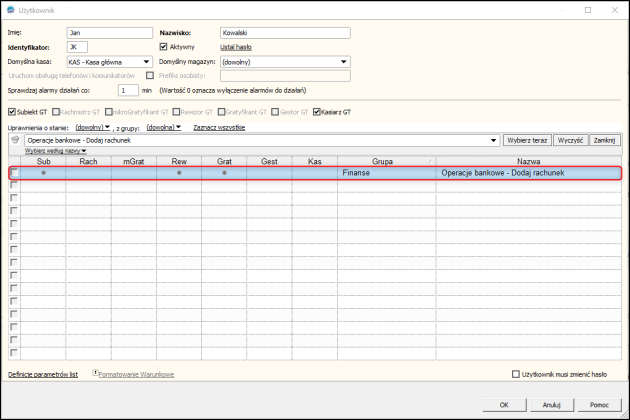 3. Na liście uprawnień odnaleźć i odznaczyć Operacje bankowe - Dodaj rachunek w grupie Finanse. Aby wyszukać po wskazanej frazie, należy wybrać filtrowanie [F8].