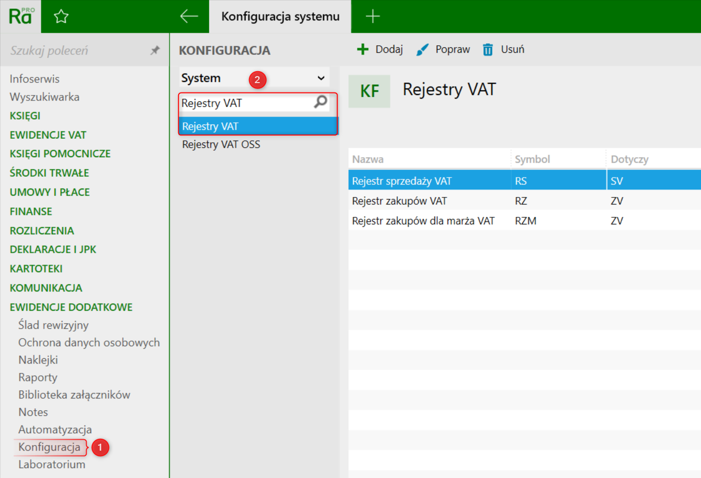 1. Przejść do modułu Konfiguracja – Rejestry VAT.