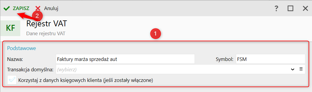 3. Uzupełnić takie dane jak Nazwa i Symbol rejestru. Wskazać Domyślną transakcję VAT. Zapisać zmiany.