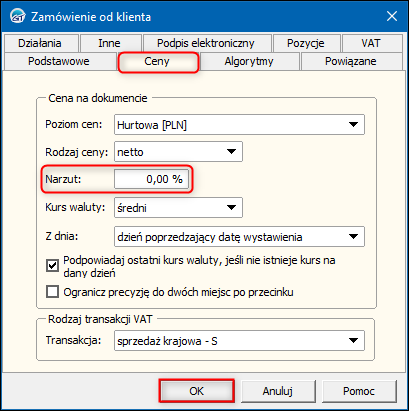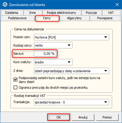​2. W oknie, które się wyświetli przejść na zakładkę Ceny i wpisać domyślny Narzut. Zmiany zapisać przyciskiem OK.