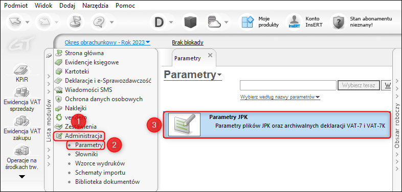 1. Z listy modułów wybrać Administracja – Parametry, a z listy parametrów Parametry JPK.