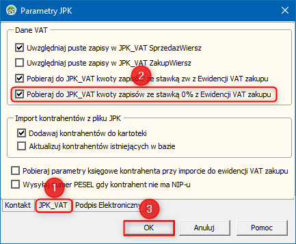 2. W oknie, które się wyświetli przejść na zakładkę JPK_VAT i zaznaczyć opcję Pobieraj do JPK_VAT kwoty zapisów ze stawką 0% z Ewidencji VAT zakupu. Zmiany zapisać przyciskiem OK.