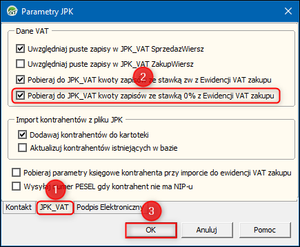 Rachmistrz i Rewizor GT – Jak włączyć pobieranie do pliku JPK zapisów z Ewidencji VAT zakupu ze stawką 0%?