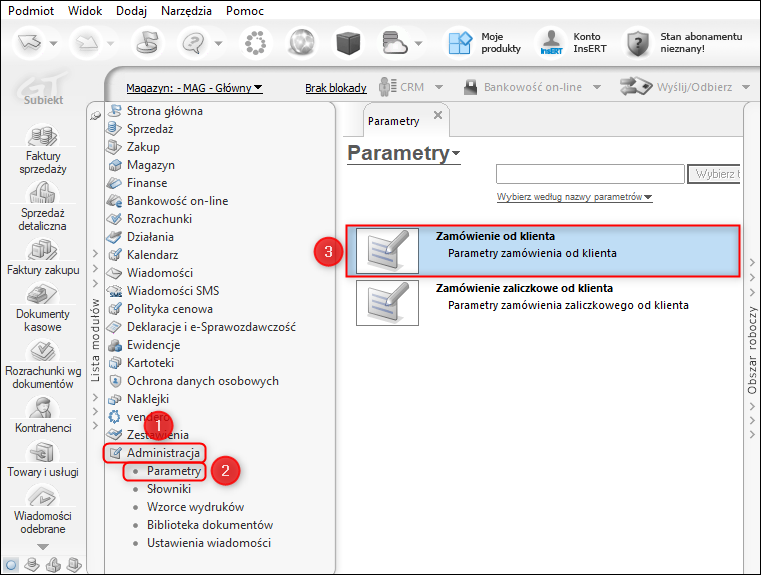 1. Z listy modułów wybrać Administracja – Parametry, a z listy parametrów Zamówienie od klienta.