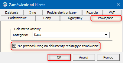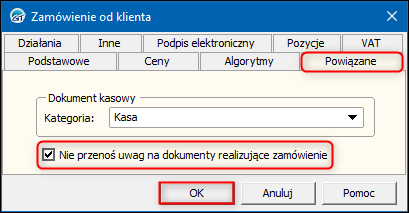 2. W oknie, które się wyświetli przejść na zakładkę Powiązane i zaznaczyć opcję Nie przenoś uwag na dokumenty realizujące zamówienie. Zmiany zapisać przyciskiem OK.