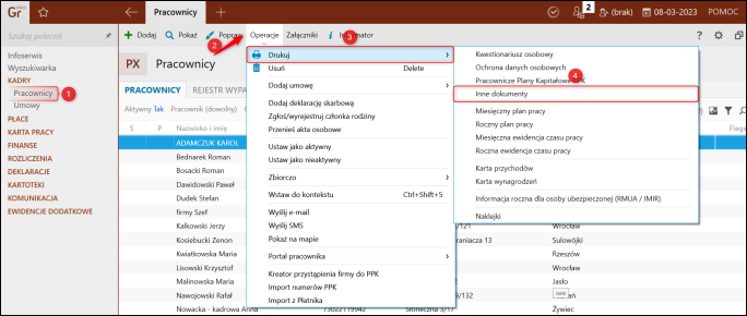 1. Przejść do modułu Pracownicy, zaznaczyć pracownika, dla którego ma zostać wykonany wydruk, a następnie z górnego menu Operacje wybrać Drukuj – Inne dokumenty.