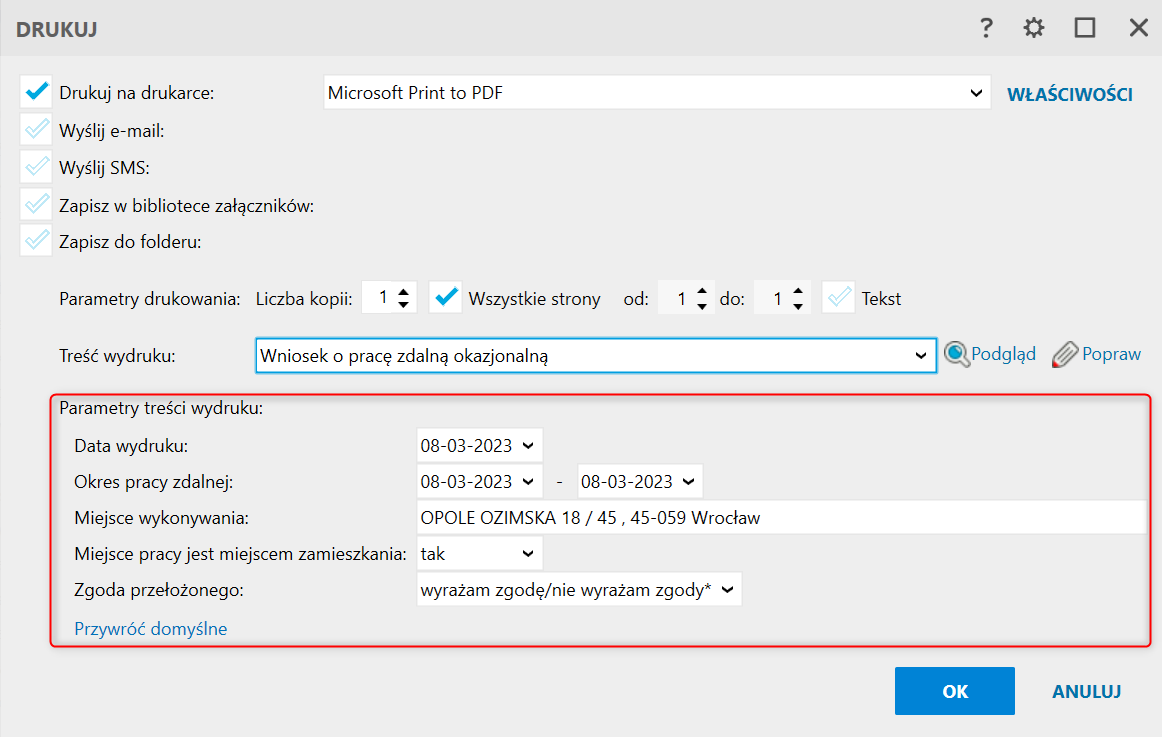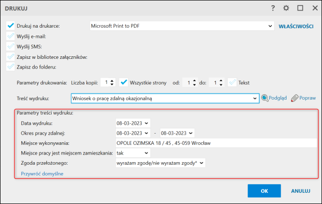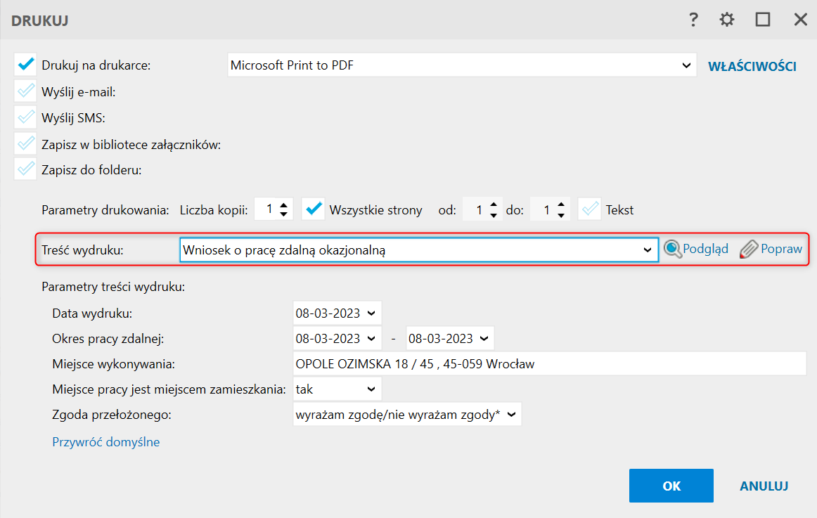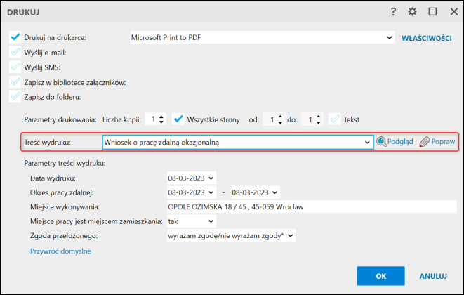 2. Treść wydruku zmienić na Wniosek o pracę zdalną okazjonalną.