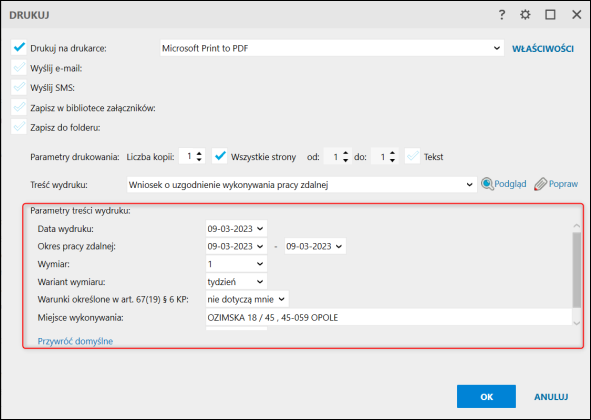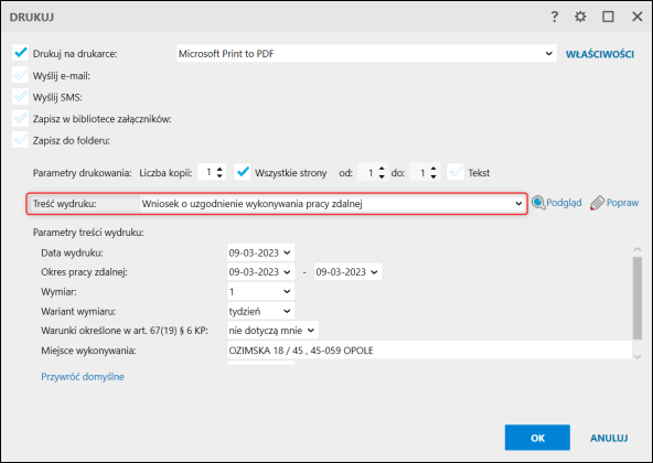 ​​2. Treść wydruku zmienić na Wniosek o uzgodnienie wykonywania pracy zdalnej.