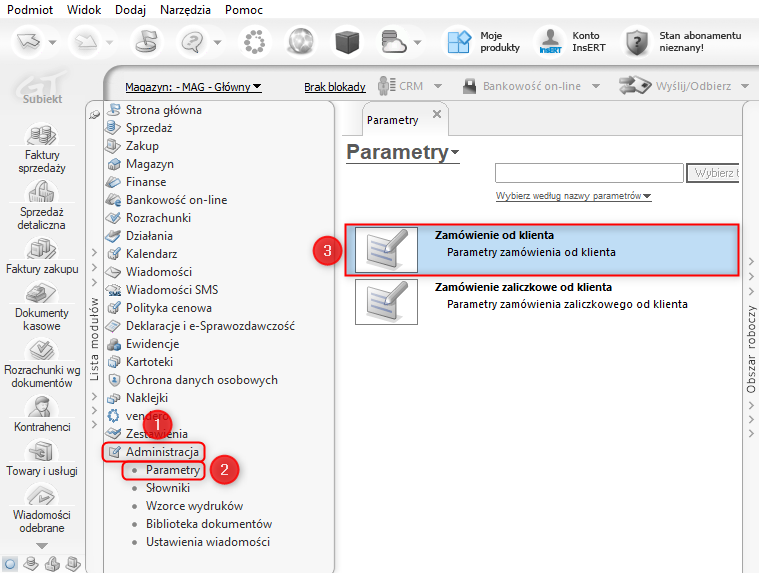 1. Z listy modułów wybrać Administracja – Parametry, a z listy parametrów Zamówienie od klienta.