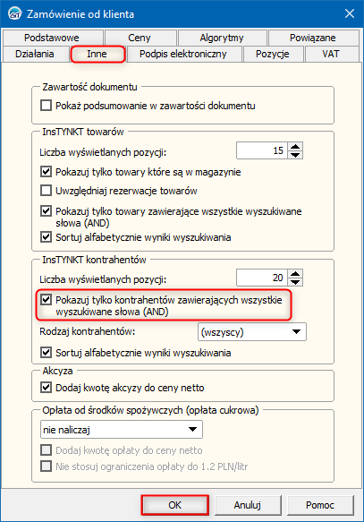 2. W oknie Zamówienie od klienta przejść na zakładkę Inne i zaznaczyć opcję Pokazuj tylko kontrahentów zawierających wszystkie wyszukiwane słowa (AND) w sekcji InsTYNKT kontrahentów. Zmiany zapisać przyciskiem OK.