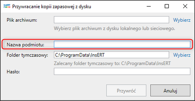Ścieżka jest zbudowana z nazwy użytkownika Windows oraz z nazwy bazy samego podmiotu.