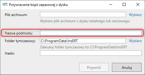Ścieżka jest zbudowana z nazwy użytkownika Windows oraz z nazwy bazy samego podmiotu.