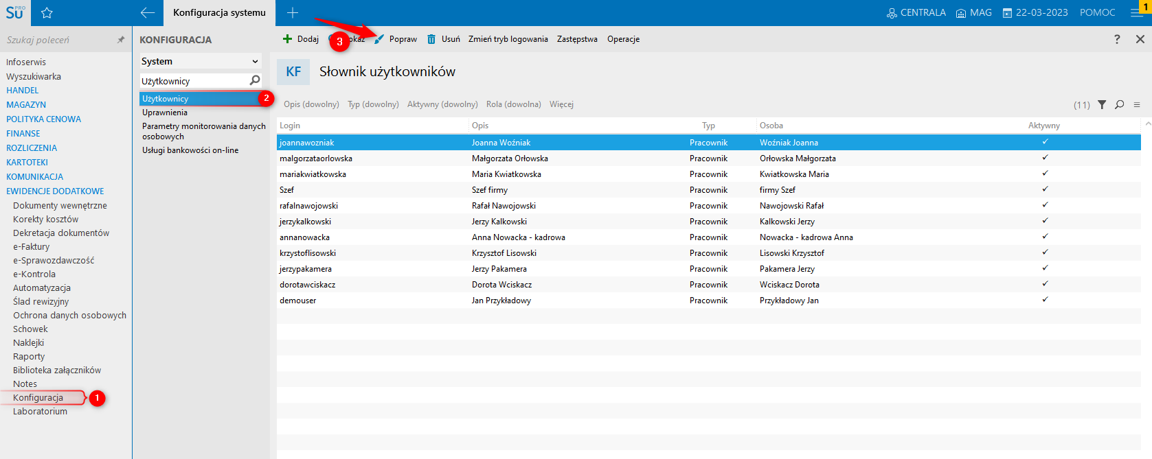 1. Wejść do modułu Konfiguracja – Użytkownicy, wskazać użytkownika na liście i wybrać opcję Popraw.
