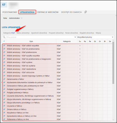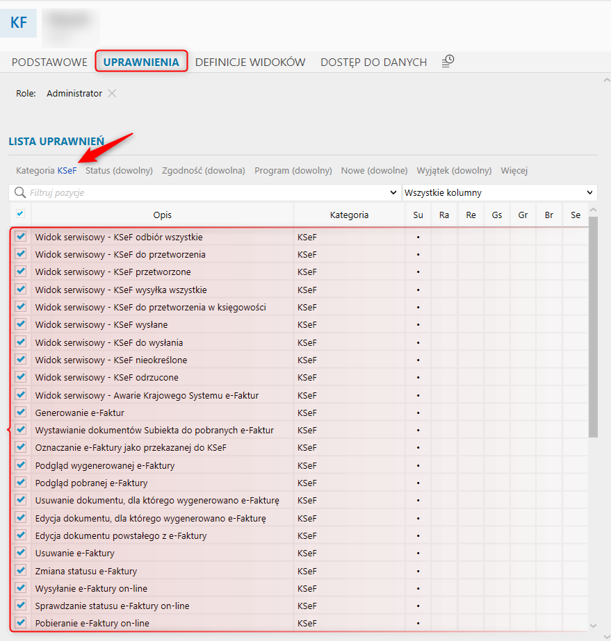2. Przejść na zakładkę Uprawnienia, odznaczyć uprawnienie zgodnie z opisem operacji, do której pracownik nie będzie miał dostępu. Dla ułatwienia można wykorzystać filtr Kategoria: KSeF.