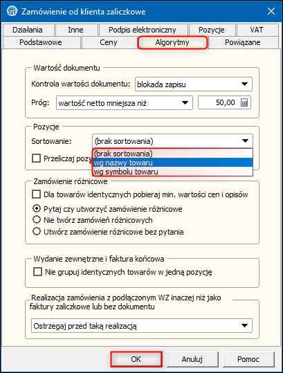 ​W celu ustawienia w programie Subiekt GT sortowania pozycji towarowych na zamówieniu zaliczkowym od klienta należy: