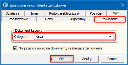 2. W oknie, które się wyświetli przejść na zakładkę Powiązane i wybrać domyślną Kategorię w sekcji Dokument kasowy. Zmiany zapisać przyciskiem OK.
