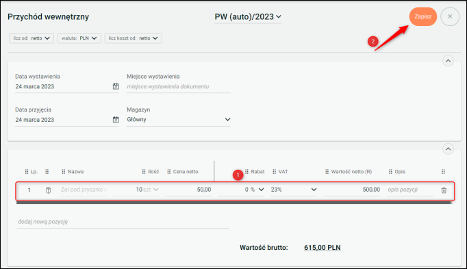 2. Wprowadzić pozycje asortymentu. Zatwierdzić przyciskiem Zapisz.