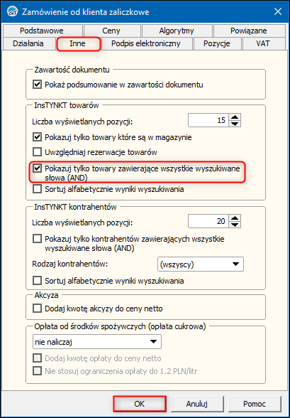 2. W oknie Zamówienie od klienta zaliczkowe przejść na zakładkę Inne i zaznaczyć opcję Pokazuj tylko towary zawierające wszystkie wyszukiwane słowa (AND) w sekcji InsTYNKT towarów. Zmiany zapisać przyciskiem OK.