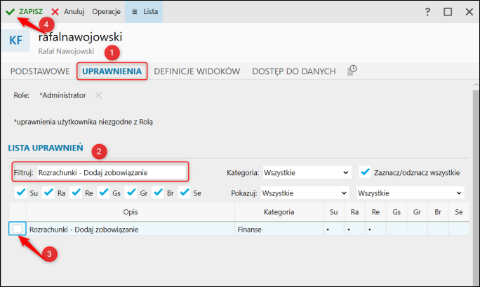 Kategoria: Rozrachunki, Uprawnienia, Użytkownicy