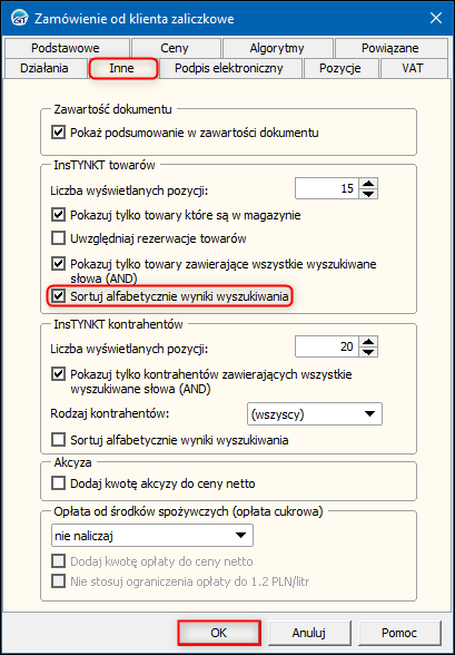2. W oknie Zamówienie od klienta zaliczkowe przejść na zakładkę Inne i zaznaczyć opcję Sortuj alfabetycznie wyniki wyszukiwania w sekcji InsTYNKT towarów. Zmiany zapisać przyciskiem OK.