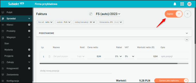 2. Dokument magazynowy zostanie zapisany i na jego podstawie zostanie wygenerowany wybrany dokument sprzedaży. Potwierdzić przyciskiem Zapisz.