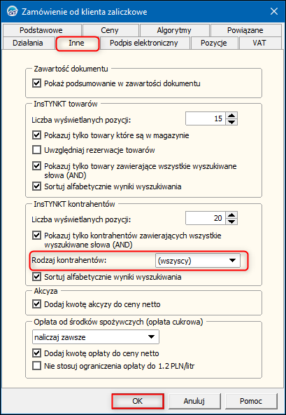 2. W oknie Zamówienie od klienta zaliczkowe przejść na zakładkę Inne ​i wybrać Rodzaj kontrahentów w sekcji InsTYNKT kontrahentów. Zmiany zapisać przyciskiem OK.​​