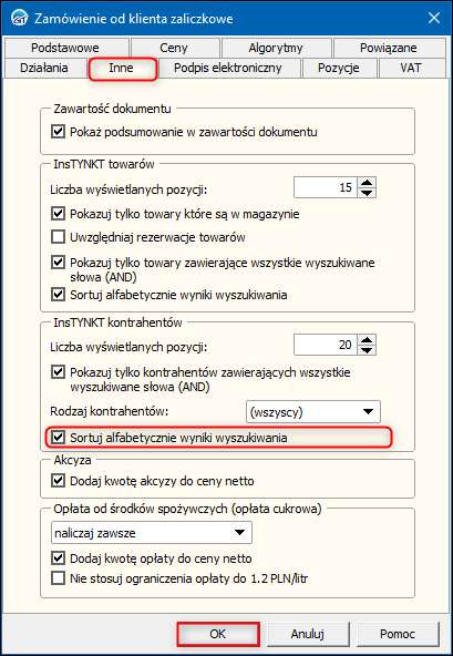 2. W oknie Zamówienie od klienta zaliczkowe przejść na zakładkę Inne i zaznaczyć opcję Sortuj alfabetycznie wyniki wyszukiwania w sekcji InsTYNKT kontrahentów. Zmiany zapisać przyciskiem OK.