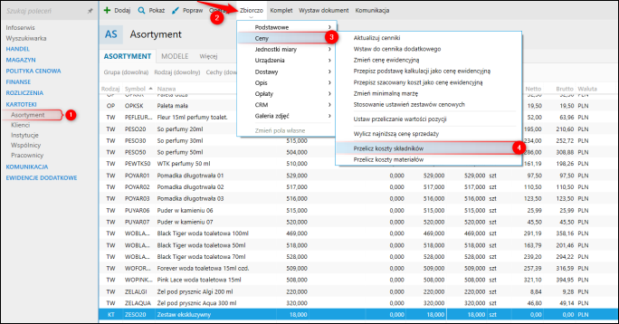 1. Przejść do modułu Asortyment, zaznaczyć odpowiednie towary i usługi, następnie z górnego menu Zbiorczo wybrać Ceny – Przelicz koszty składników.