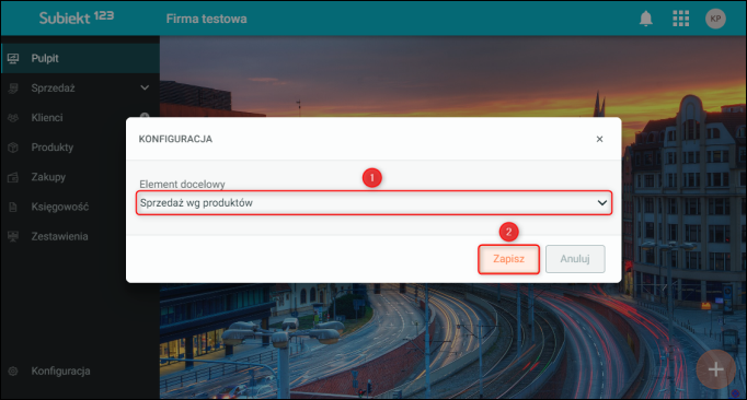 2. W polu Element docelowy wskazać Sprzedaż wg produktów i wcisnąć Zapisz.