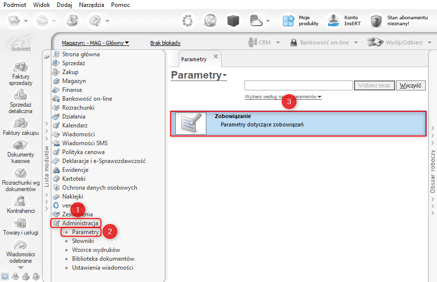 1. Z listy modułów wybrać Administracja – Parametry, a z listy parametrów Zobowiązanie