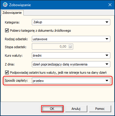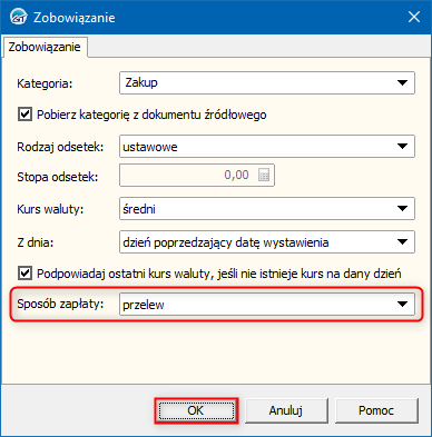 2. W oknie, które się wyświetli wybrać domyślny Sposób zapłaty. Zmiany zapisać przyciskiem OK.