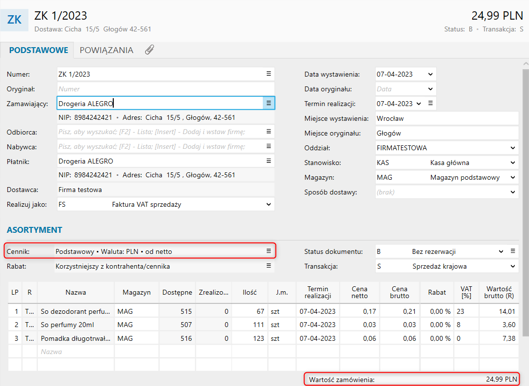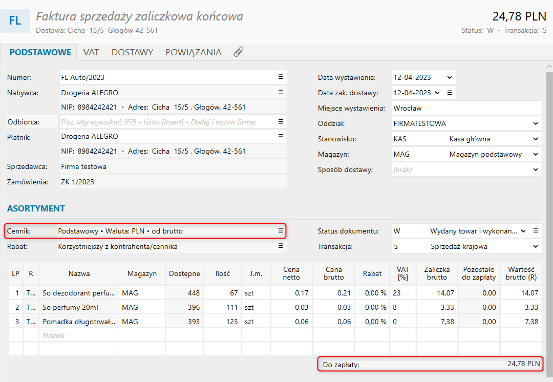 W przypadku gdy zamówienie jest liczone od ceny netto (Zdjęcie 1), a zaliczkowa od brutto (Zdjęcie 2) może to skutkować innymi wynikami, a jest to spowodowane bezwzględnemu wyliczaniu matematycznemu. W zależności od wyboru sposobu wyliczania dokumentu cena może być nieco inna. Należy również pamiętać, że według obowiązującego prawa, dokumenty zaliczkowe muszą być wyliczane od brutto.