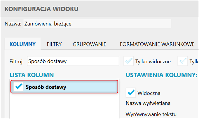 2. W polu Filtruj wpisać Sposób dostawy, zaznaczyć wyszukaną kolumnę na liście poniżej i zatwierdzić przyciskiem OK.
