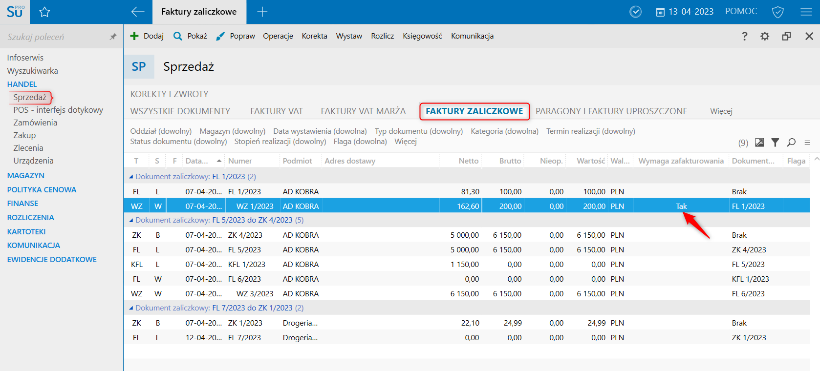 W celu kontrolowania takich sytuacji użytkownik ma możliwość do widoku Faktur zaliczkowych, dodać kolumnę Wymaga zafakturowania. Artykuł jak dodać tę kolumnę do widoku w programie znajduje się tutaj.