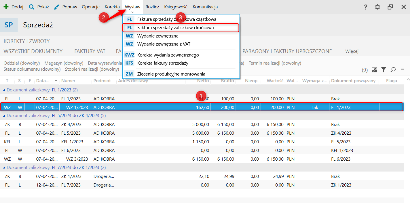 1. Zaznaczyć na liście dokument wydania zewnętrznego, następnie wybrać Wystaw – Faktura zaliczkowa końcowa.